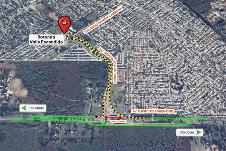 Al llegar a la intersección de avenida Ejército Argentino y avenida República de China, los vehículos no podrán continuar su recorrido habitual y deberán girar obligatoriamente a la derecha por República de China. Desde allí, deberán avanzar hasta la rotonda de ingreso a Valle Escondido para realizar el retorno.